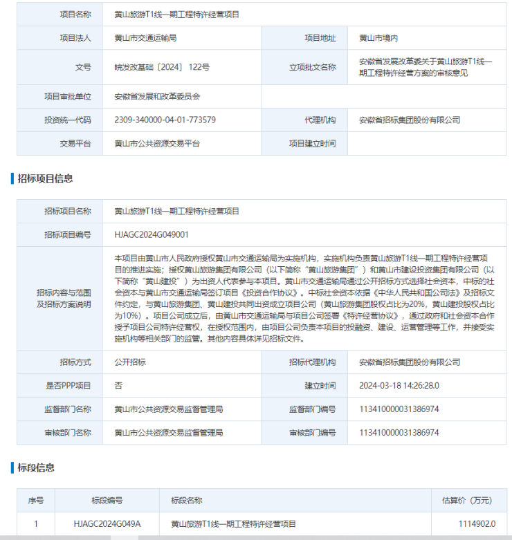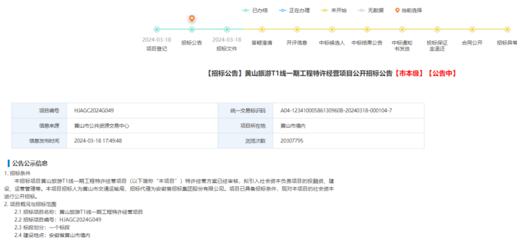 3月18日,黄山市公共资源交易中心等发布《黄山旅游T1线一期工程特许经营项目公开招标公告》。