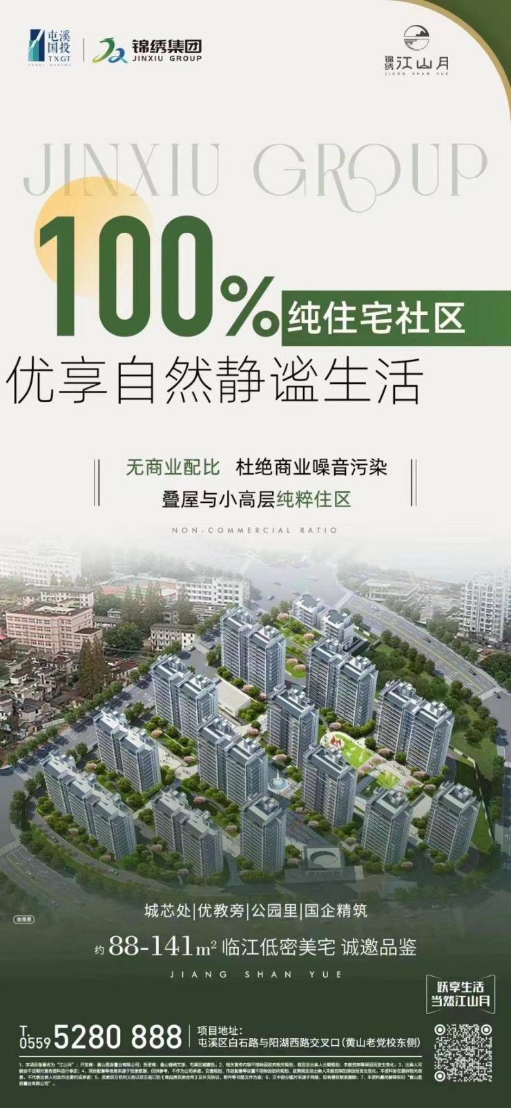锦绣江山月是由屯溪国投、锦绣集团联袂打造的匠心力作,项目择址屯溪区新安江南岸老阳湖核心位置,接驳新安大道、徽州大道,立体交通路网。坐享街角公园、江心洲公园、南滨江景观带等生态资源,元一、阳湖农贸市场、百大商贸城、老街等商圈配套环伺。臻质美学作品,建面约88-141㎡双匠精筑,营造都市质感生活。总规划1幢6层叠墅、3幢11层及10幢14层小高层住宅。