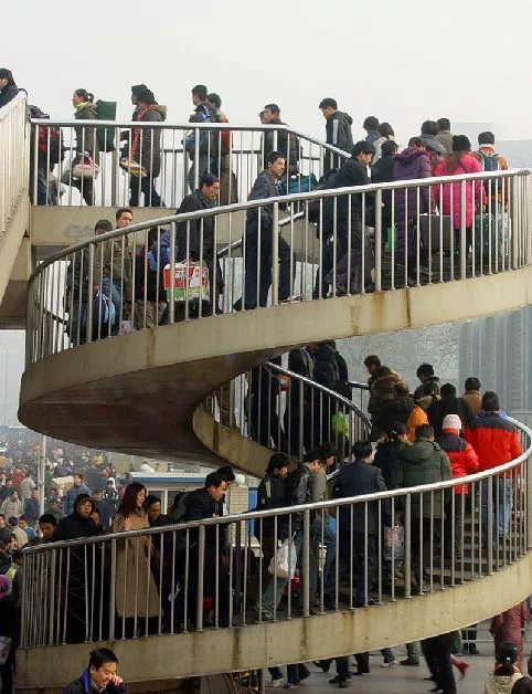 2006年1月14日,北京火车站过街天桥人流擁挤。