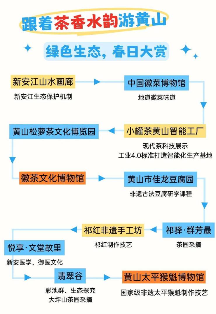 黄山风景区、西递、宏村、唐模、棠樾牌坊群·鲍家花园、花山谜窟(日游)、翡翠谷、太平湖、九龙瀑、新安江山水画廊、雄村、齐云山、赛金花-归园、南屏、芙蓉谷、打鼓岭、屏山