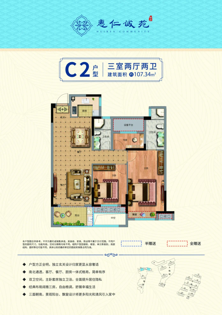 西苑户型南北通透,方正全明,餐客双厅一体设计,南向三开间,更大面积接触阳光与清风,双朝阳卧室,阔景休闲飘窗及阳台,让生活空间层次更加丰富,科学双卫设计,有效解决卫生间使用冲突的问题,更大空间利用率,提高居住幸福感。