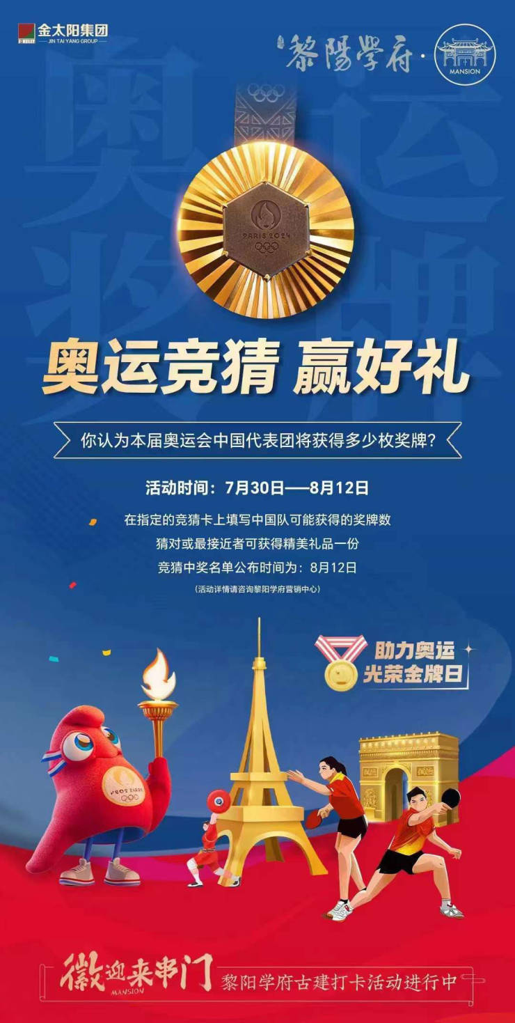 助力奥运,竞猜赢好礼!在指定的竞猜卡上填写中国队可能获得的奖牌数猜对或最接近者可获得精美礼品一份。竞猜时间:7月30日-8月12日;竞猜中奖名单公布时间为:8月12日(活动详情请咨询黎阳学府营销中心)。