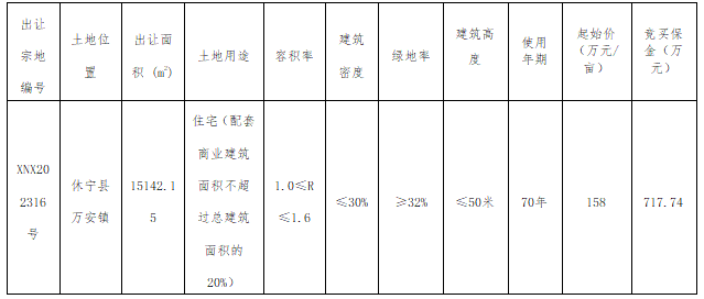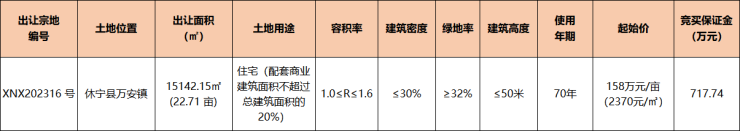 2023年6月6日,休宁县万安镇1宗住宅用地(宗地编号:XNX202316号)挂牌,总出让面积15142.15㎡(合约22.71亩),起拍总价3588.69万元,起拍单价2370元/㎡(158万元/亩),起拍楼面地价1481.25元/㎡,拍卖时间:7月10日15时30分。
