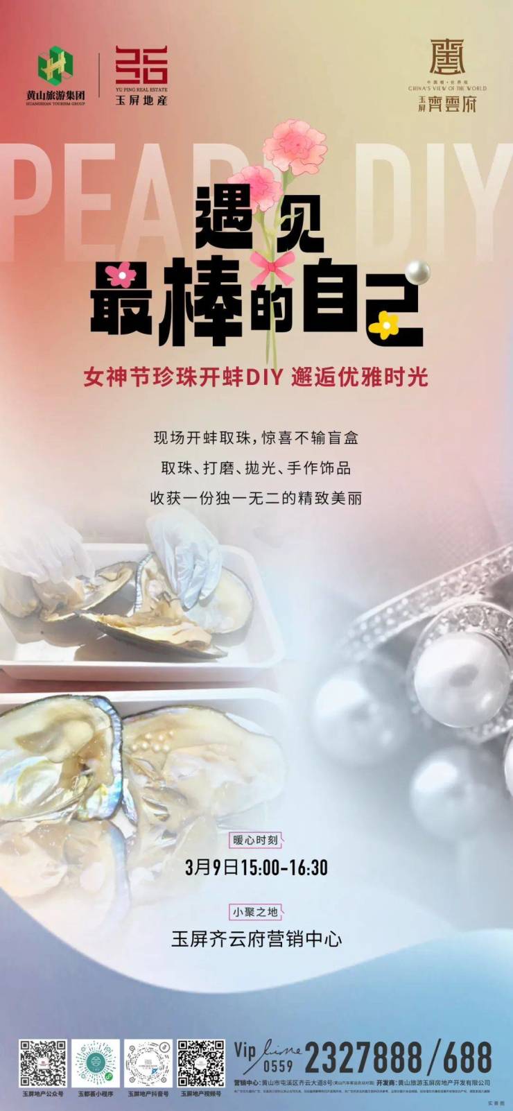 遇见最棒的自己!玉屏齐云府女神节珍珠开蚌DIY,邂逅优雅时光,3月9日15:00-16:30美丽开启,现场开蚌取珠,惊喜不输盲盒,取珠、打磨、抛光、手作饰品,收获一份独一无二的精致美丽。