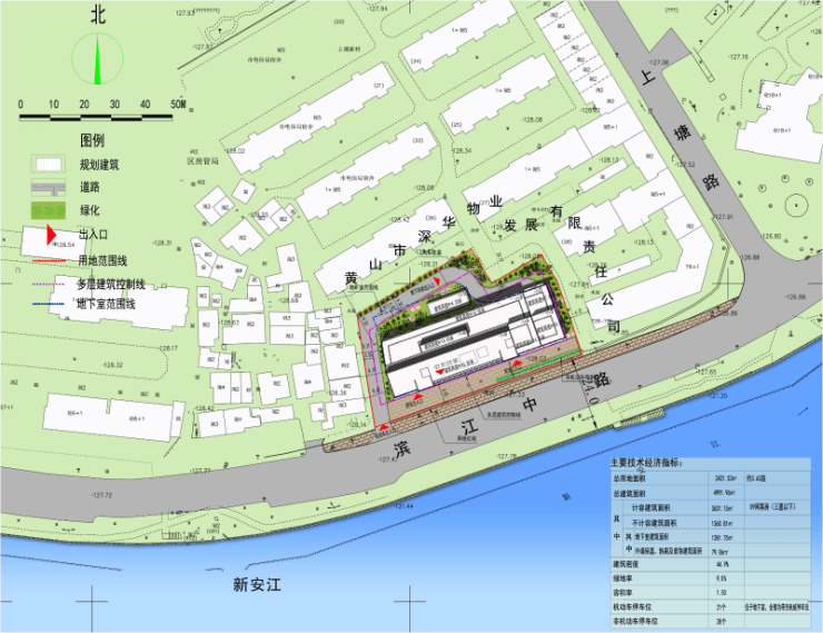 项目地块位于滨江路北侧、上塘新村南侧,用地面积2421.53平方米,性质商业用地,建设单位为黄山湘源建设投资有限公司。项目地块规划建设酒店综合楼,层数为3-4层(局部2层),规划总建筑面积约4992平方米,其中计容面积约3631平方米,不计容建筑面积约1361平方米,容积率1.5。酒店综合楼主体采用退台式布局,其中北侧为三层,建筑高度为10.85米,南侧为四层,建筑高度为16.85米,新建建筑与北侧上塘新村26栋楼建筑间距约19.5米,与上塘新村27栋建筑间距约24.1米,与西侧已有建筑外墙间距最小值约8米。经审查,项目方案建筑间距、建筑退让及各项技术经济指标满足相关要求。根据有关规定,现将项目规划总平面图、效果图予以公示,如有意见和建议,请在公示期内向我局反馈。