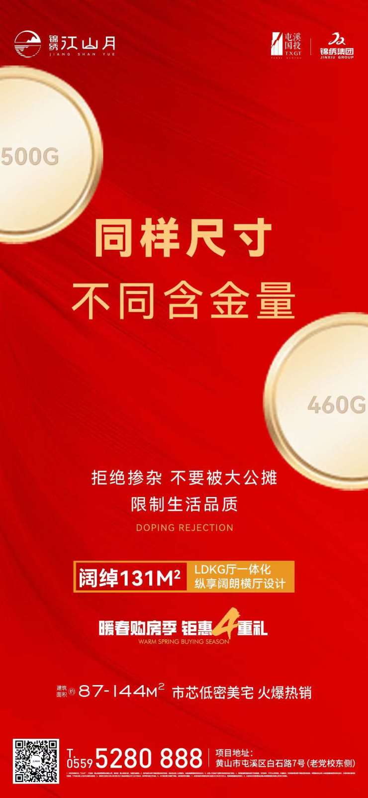 同样尺寸不同含金量,拒绝掺杂 不要被大公摊限制生活品质。锦绣江山月阔绰131㎡户型,LDKG厅一体化,纵享阔朗横厅设计。暖春购房,钜惠四重好礼:来访礼,来访送好礼;认购礼,暖春认购优惠放肆享;签约礼 ,按时签约即享砸金蛋赢家电;安家礼,春日特惠房源限时抢。建面约87-144㎡市芯低密美宅热售中,均价12500元/㎡。