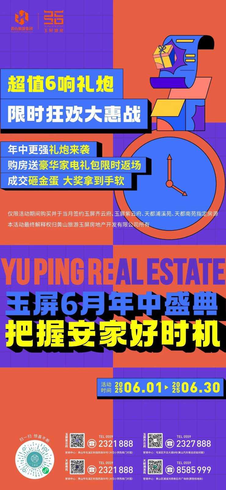 活动期间玉屏齐云府、玉屏紫云府、天都浦溪苑、天都南苑限时推出年中特惠房源(以各项目案场公示为准)!