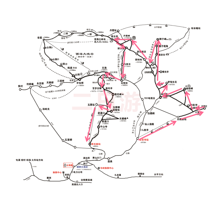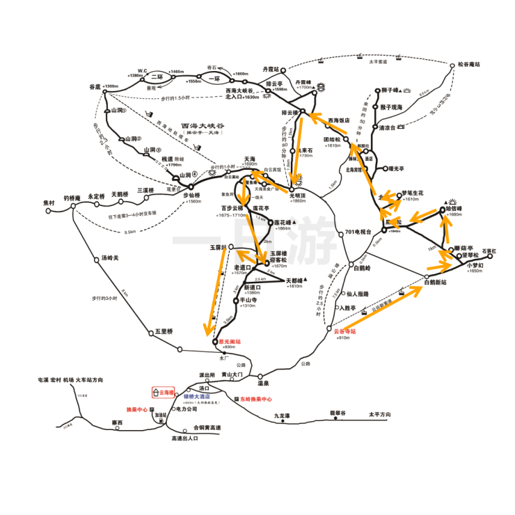 黄山南大门入→云谷索道上行→石笋矼→始信峰→黑虎松→大王松→光明顶→鳌鱼峰→百步云梯→迎客松→玉屏索道下行→黄山南大门