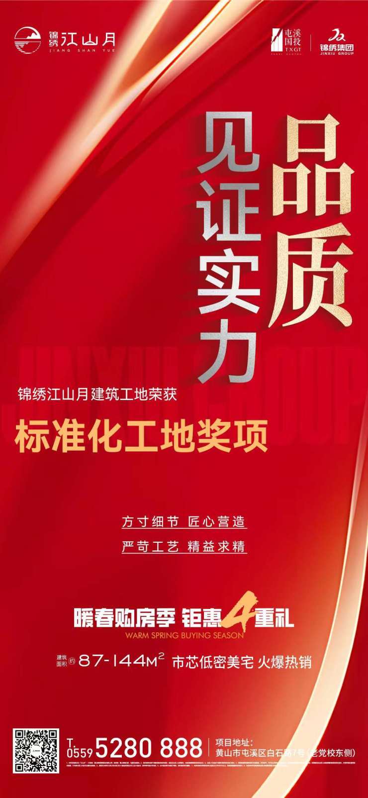 品质见证实力,方寸细节匠心营造,严苛工艺精益求精,锦绣江山月建筑工地荣获标准化工地奖项。暖春购房四重好礼:来访礼,来访送好礼;认购礼,暖春认购优惠放肆享;签约礼 ,按时签约即享砸金蛋赢家电;安家礼,春日特惠房源限时抢。建面约87-144㎡市芯低密美宅热售中,均价12500元/㎡。