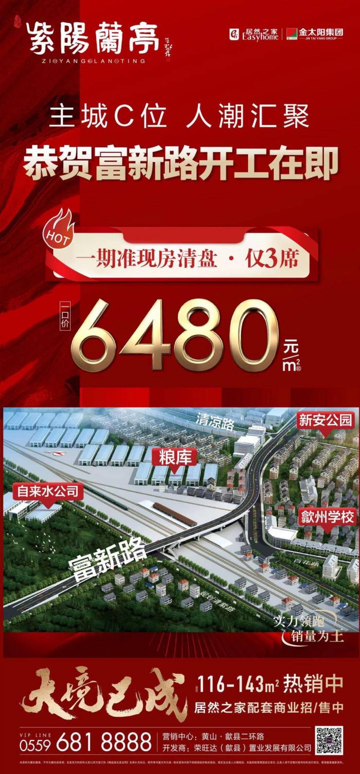 富新路开工在即,歙县紫阳兰亭重大利好来袭!现一期清盘倒计时,准现房、仅3席、钜惠一口价仅6480元/㎡。主城C位,人潮汇聚!紫阳兰亭建面约116-143㎡优质房源热销中,居然之家配套商业全城火爆招/售中!