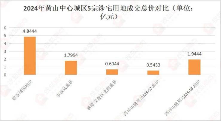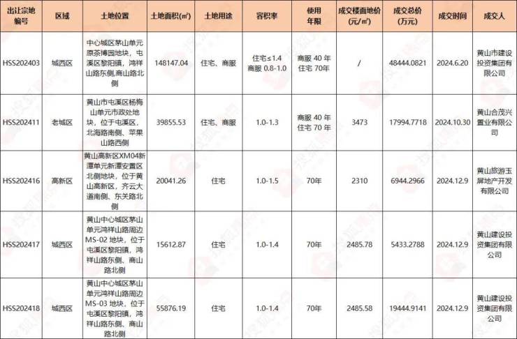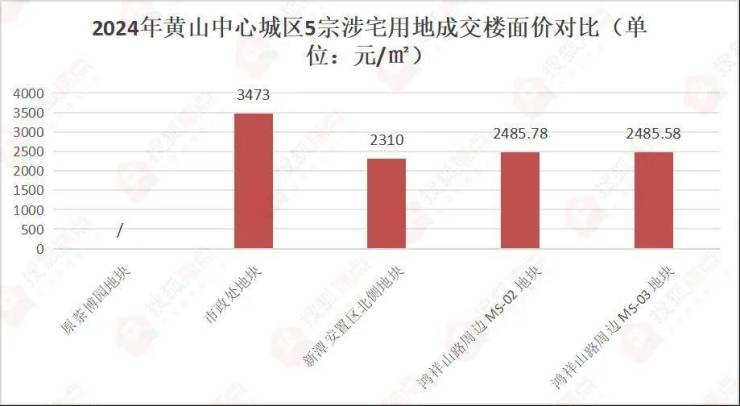 2024年12月9日,黄山旅游玉屏房地产开发有限公司竞得的新潭安置区北侧地块,成交楼面地价2310元/㎡,为2024年黄山中心城区楼面地价最低地块。