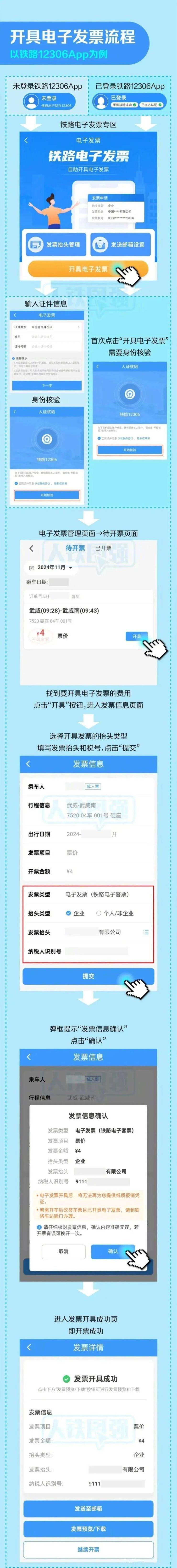旅客在行程结束或者支付退票(改签)费用后180天内,可登录本人铁路12306账户申请开具电子发票,在输入购买方名称、统一社会信用代码等信息后,系统将据实开具电子发票,并向税务部门上传电子发票的数据文件。旅客可通过铁路12306或个人所得税App查询、下载电子发票。
