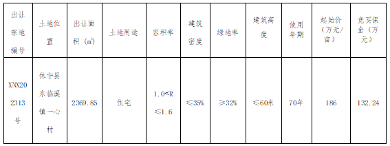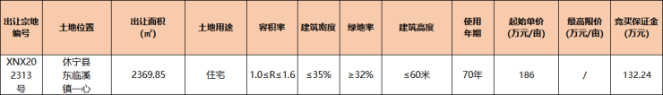 2023年3月31日,休宁县1宗住宅用地挂牌出让,宗地位于东临溪镇一心村,出让面积2369.85㎡(合3.55亩),起始总价661.19万元,起拍单价2790元/㎡(186万元/亩),起拍楼面地价1743.75元/㎡。拍卖时间:2023年5月4日15时30分。
