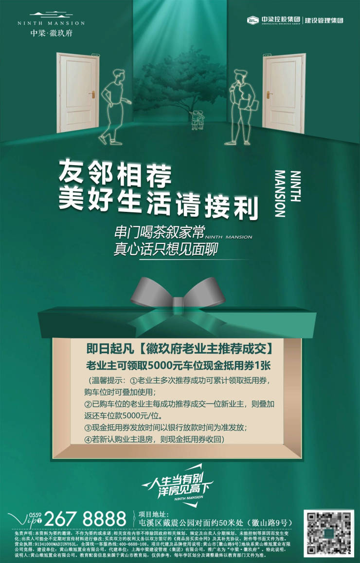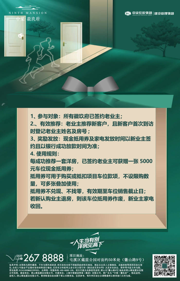 即日起凡【徽玖府老业主推荐成交】,老业主可领取5️⃣0️⃣0️⃣0️⃣元车位现金抵用券1张!