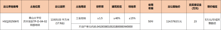 (三)竞得人自签订成交确认书30日内同黄山太平经济开发区管理委员会签订《工业项目用地投入产出监管合同》,10个工作日内签订出让合同。受让人需保证HSQ202506号地块:1.该地块投资额不低于3580万元,2.投资强度不低于200万元/亩,3.亩均税收不低于15万元/年,4.单位工业增加值能耗不高于0.88吨标煤/万元,5.单位工业增加排放值排放按照《安徽黄山太平经开区区域节能报告》的要求执行,6.其他指标满足“三线一单”和经开区环评要求,严格落实环评、“三同时”和排污许可要求,7.投产时间为开工建设之日起2年内。