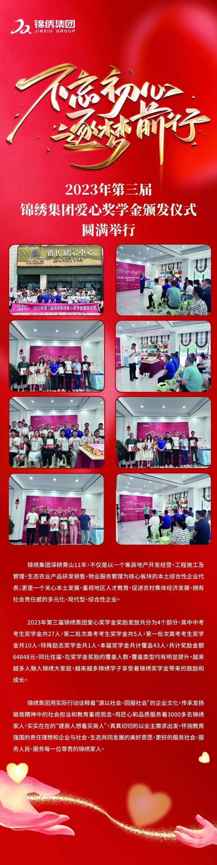 不忘初心,逐梦前行!2023年第三届锦绣集团爱心奖学金颁发仪式圆满举行。…
