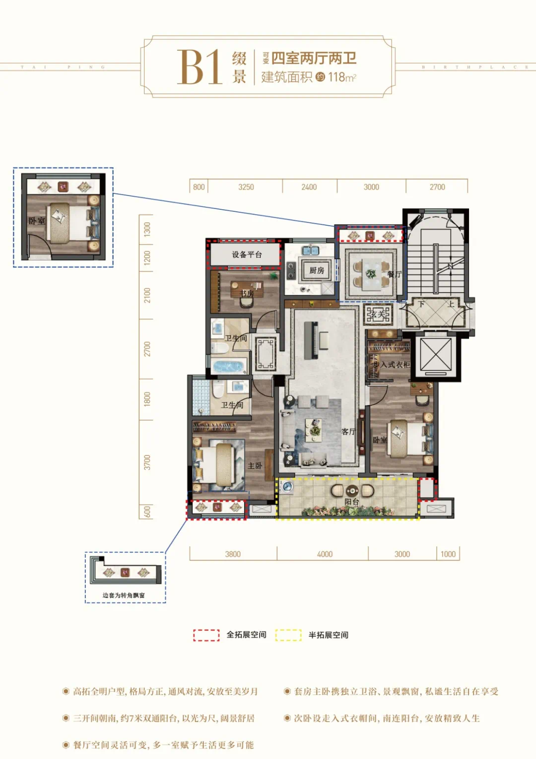 精研当代都市家庭的生活方式,太平故里建筑面积约90-130㎡电梯花园洋房,以人所需的生活尺度科学打造家的场景,筑就奢适开阔的生活空间。以约118方户型为例,高拓展面积,极尽空间利用的可能性,不仅扩容生活领域,更在阔绰家中奢享人生欢畅。明厨、明卫、明厅、明室的全明户型,加上大面玻璃幕墙,让生活从不缺阳光和风景的陪伴。