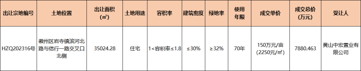 2023年12月22日,徽州区岩寺镇滨河北路与信行一路交叉口北侧江景住宅地块(宗地编号:HZQ202316)成交,由黄山中宏置业有限公司(望府未来项目开发商)底价竞得,成交总价7880.463万元,成交单价为150万元/亩(折2250元/㎡),成交楼面地价为1250元/㎡。