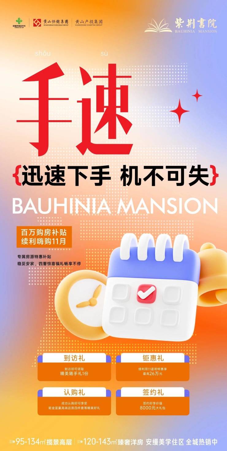 迅速下手 机不可失!紫荆书院百万购房补贴,续利嗨购11月。专属房源特惠补贴,稳妥安家,四重惊喜福礼畅享不停。到访礼:到访即可免费领取精美随手礼1份;
