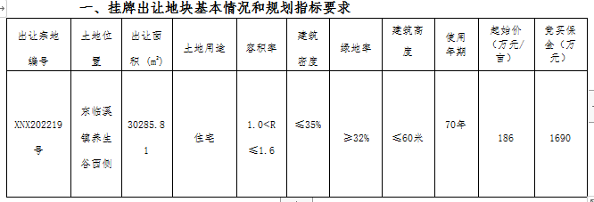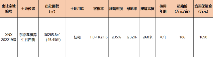 2022年9月16日,休宁县东临溪镇养生谷西侧地块(宗地编号:XNX202219)再次挂牌,地块位于东临溪镇养生谷西侧。地块总面积30285.8㎡(45.4287亩),土地用途为住宅,容积率1.0<R≤1.6;本次国有建设用地使用权挂牌出让为有底价挂牌出让,即设有底价,不达底价不成交。