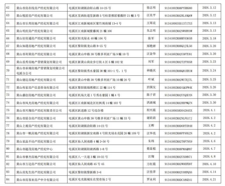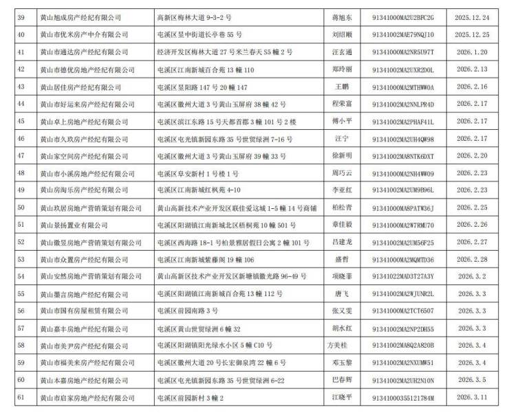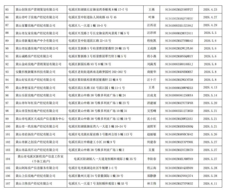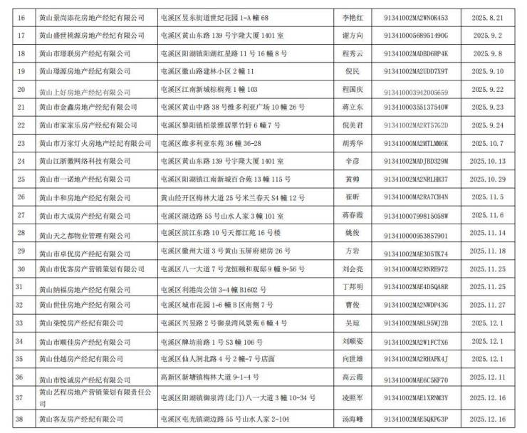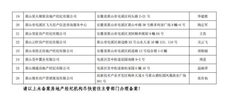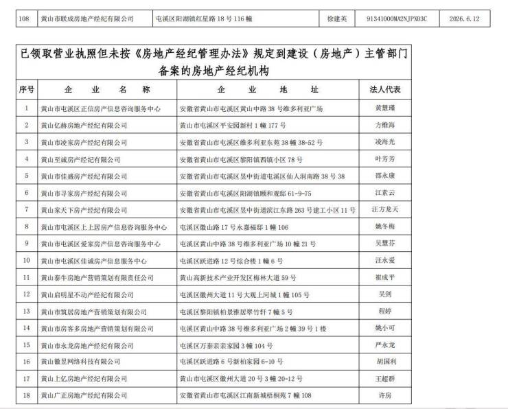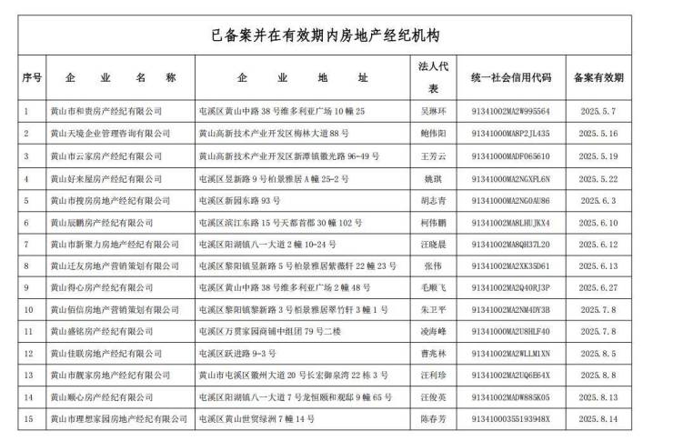 截至 2025 年 6 月 15 日,黄山市中心城区已备案并在有效期内的房地产经纪机构 108 家,未备案房地产经纪机构 26 家,现将具体情况公示如下: