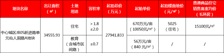 JB05跃进路单元仙人洞路A地块( 宗地编号:HSS202212),位于屯溪区仙人洞南路西侧、新园西路北侧,地块总面积34555.93㎡(51.83亩),土地用途为住宅、教育设施用地,起始总价为27941.833万元,需在地块西南角教育设施用地内配建 12 班幼儿园。其中,住宅用地出让面积27186.9 ㎡,容积率>1.8、≤2.0;起拍楼面地价5025元/㎡,起始单价为670万元/亩(10050 元/㎡),较高限价为1097万元/亩。 商品住宅的销售备案均价为15100元/㎡(毛坯房);教育设施用地(幼儿园用地,含城市区间路)出让面积7369.03 ㎡,容积率≤0.7;出让单价 56万元/亩(840 元/㎡)固定不变,不进行竞价。