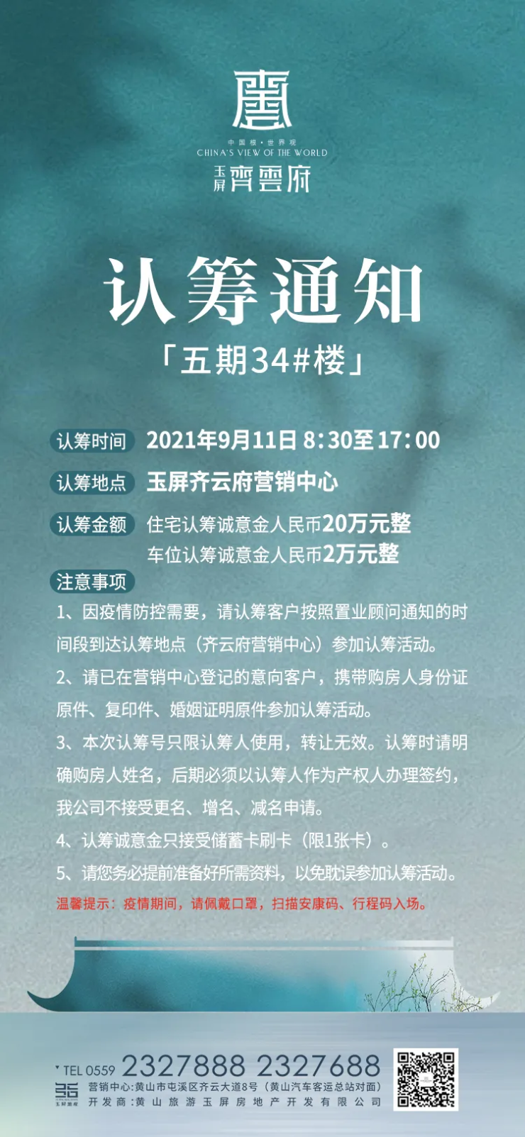 价格洼地,欲购从速!玉屏齐云府五期34#楼将于9月11日(本周六)8:30-17:00进行认筹,认筹地点玉屏齐云府营销中心,住宅认筹诚意金人民币20万元整,车位认筹诚意金人民币2万元整;34#楼央景楼座建筑面积约118-159㎡,一梯两户设计,共计110套房源(含棚改),备案均价8440元/㎡。