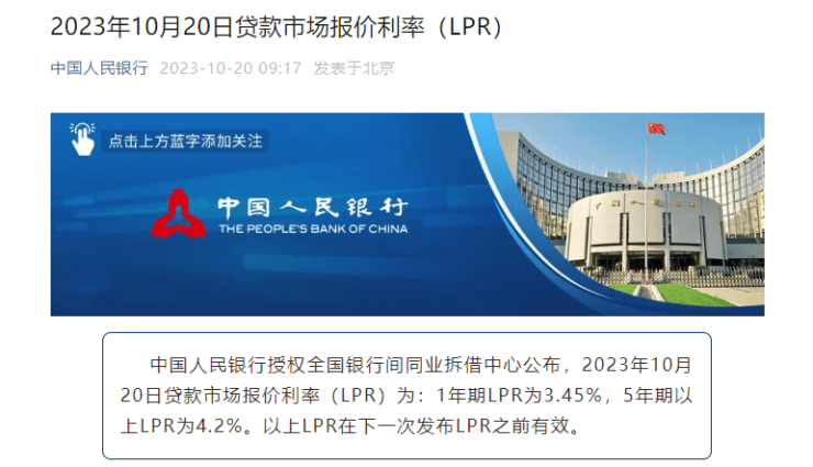 中国人民银行授权全国银行间同业拆借中心公布,2023年10月20日贷款市场报价利率(LPR)为:1年期LPR为3.45%,5年期以上LPR为4.2%。以上LPR在下一次发布LPR之前有效。