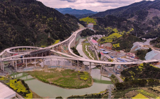 3月23日,歙县武阳乡大川岛,建设中的黄千高速(安徽段)武阳互通枢纽,架梁和桥面施工气势恢宏。据了解,2022年我市交通建设预期目标是:完成交通基础设施建设投资48.51亿元,其中高速公路40亿元,国省干线公路3.47亿元,农村公路2.2亿元,公路客运场站2.84亿元。