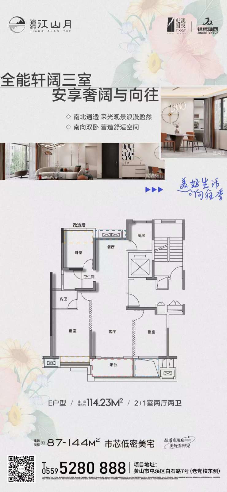 全能轩阔三室,安享奢阔与向往。锦绣江山月建面约114.23㎡户型,南北通透,采光观景浪漫盈然,南向双卧,营造舒适空间。即将准现房呈现,建面约87-144㎡市芯低密美宅热售中,均价12500元/㎡。