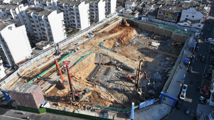 枫树巷工地上,大型桩基设备轰鸣作响,工人们头戴安全帽,在钢筋水泥间穿梭忙碌。记者在现场看到,地下停车场的基坑支护工程已接近尾声,深达十余米的基坑轮廓清晰可见,支护桩整齐排列。