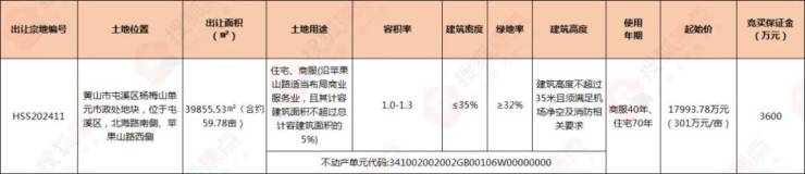 2024年9月,黄山中心城区杨梅山单元市政处商住地块挂牌,地块位于屯溪区北海路南侧,苹果山路西侧,总出让面积39855.53㎡(合约59.78亩),起拍总价17993.78万元,起拍单价4515元/㎡(301万元/亩),起拍楼面地价3473元/㎡。