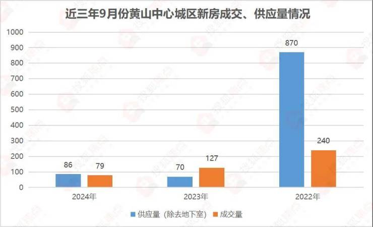 2024年9月,黄山中心城区新房总计成交79套,环比于8月的58套,上涨36.2%;与去年同期的127套相比,下降37.8%。
