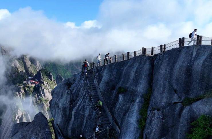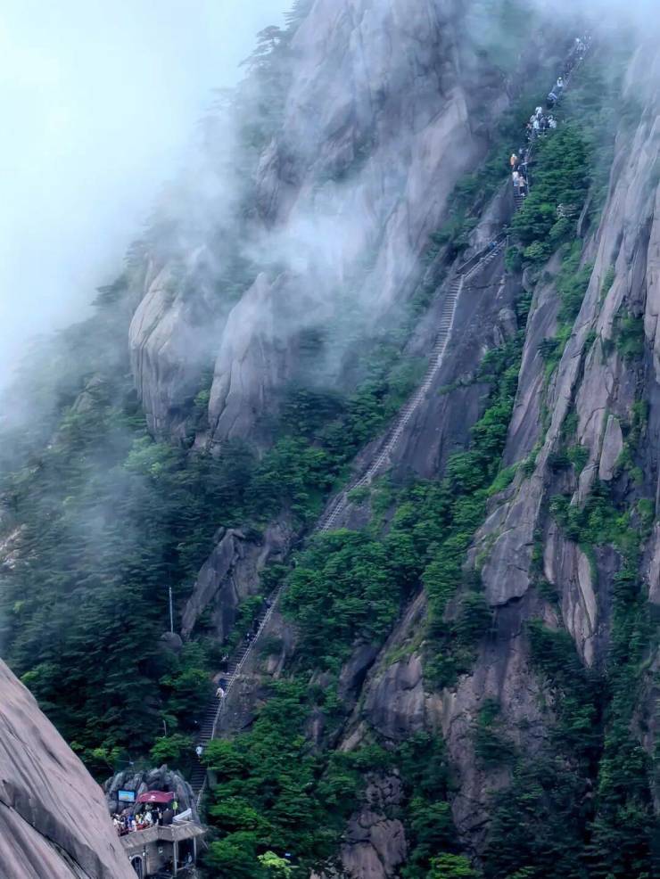 如果想要更险峻的登山体验,不妨选择这条非同寻常的路径,它更是对胆识与体力的极致考验。全长1050米,高差420米,宽0.5至1米,沿途可观“试胆石”“二僧朝天都”“老虎嘴”“天都贴壁松”“三姑洞”等松石奇景。脚下云雾缭绕,远眺群峰如剑,近观古松扎根绝壁,奇景迭出,可谓一步一幻。