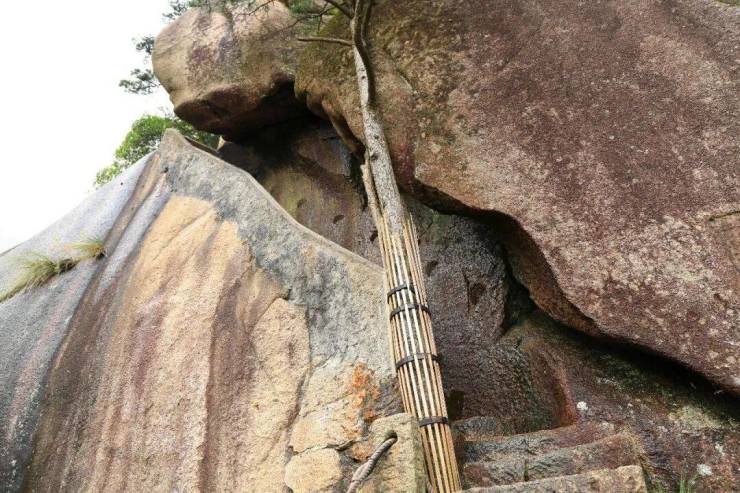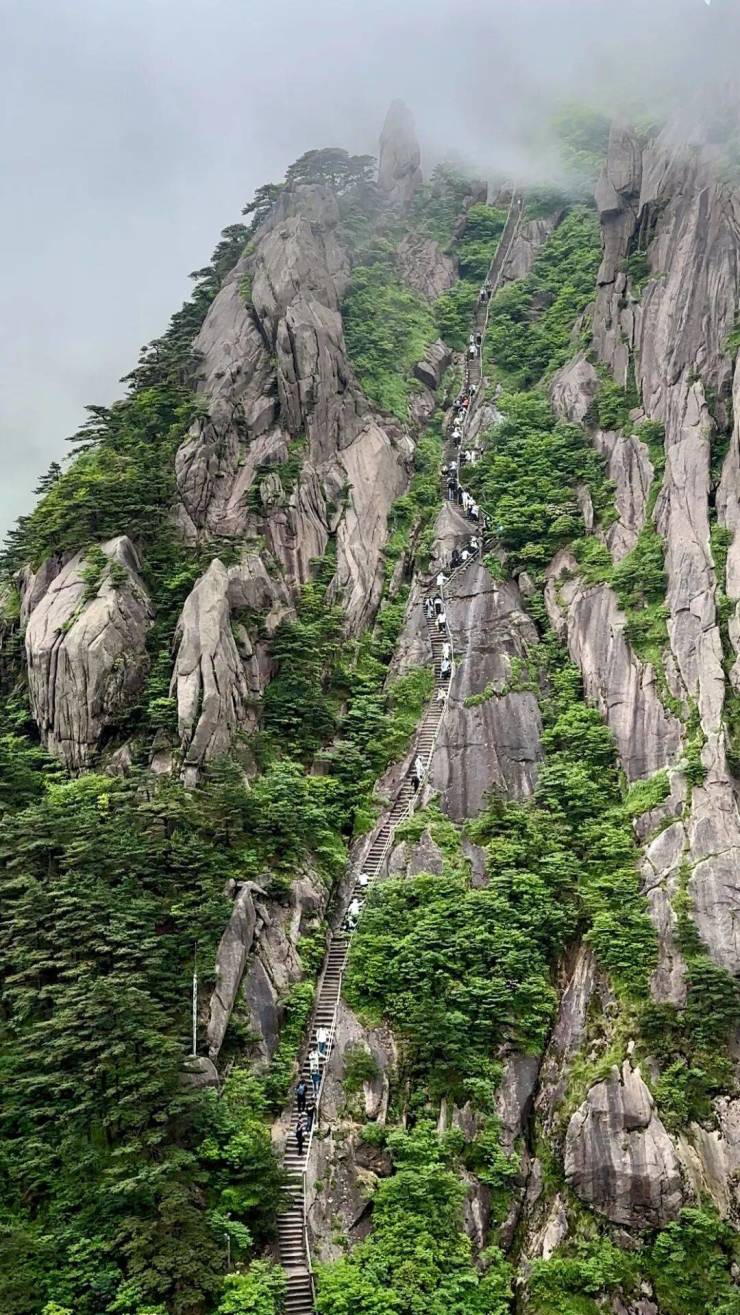 从天都峰脚,沿峰壁危岩直上,全长650米,高差310米,坡陡路险,宛如一条悬梯,故俗有“天梯”之称。峰顶有“登峰造极”、“探奇”等石刻,极目远眺,蓝天与白云融为一体,浩瀚无边;俯身俯瞰,群山连绵起伏,千峰争奇斗艳,尽显大自然的磅礴与壮丽,让人心潮澎湃,沉醉于这绝美的景致之中。