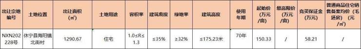 2022年11月11日,休宁县XNX202228号住宅用地挂牌出让,宗地位于休宁县海阳镇北街村,出让面积1290.67㎡(合1.94亩),容积率1.0≤R≤1.3,起拍单价150.33万元/亩(2255元/㎡),起拍总价291.05万元。拍卖时间:2022年12月14日15时30分