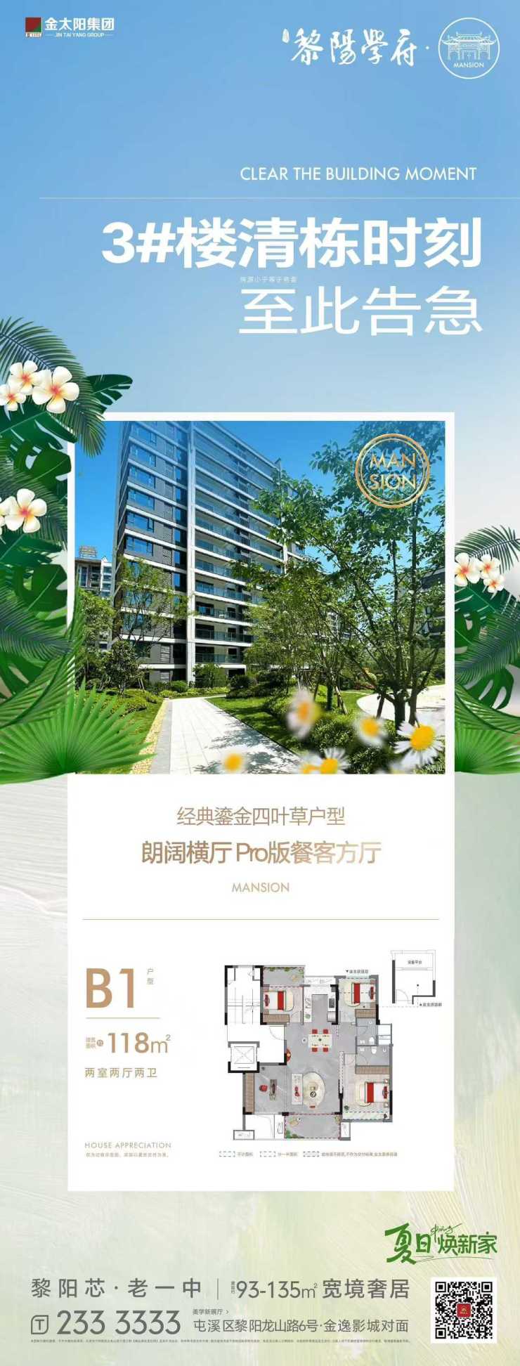 热销好房,清栋时刻。黎阳学府3#楼建面约118㎡经典鎏金四叶草户型,朗阔横厅 Pro版餐客方厅,家庭聚会,社交待客,无压力;南北双阳台,清风穿堂而过,自然风景封藏日常生活;主卧飘窗,私享尊崇生活。