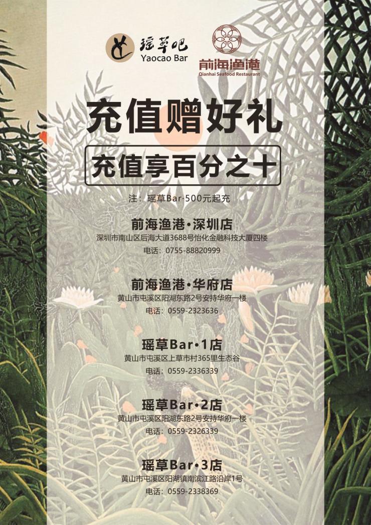 瑶草Bar&前海渔港同步上线“充值赠好礼”活动,瑶草Bar(1、2、3店)仅500元即可起充,充值享百分之十。