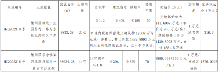 二、竞买人资格及条件:1、HZQ202310号地块须为公司法人竞买,不接受联合申请; 2、HZQ202316号地块中华人民共和国境内外的法人、自然人和其他组织(除法律、法规另有规定外)均可申请参加,申请人可以单独申请,也可以联合申请;3、HZQ202316号项目房屋达到交房条件后,黄山市自然资源和规划局徽州分局可提供“交房即办证”服务,土地竞得人可实现“交房即办证”。