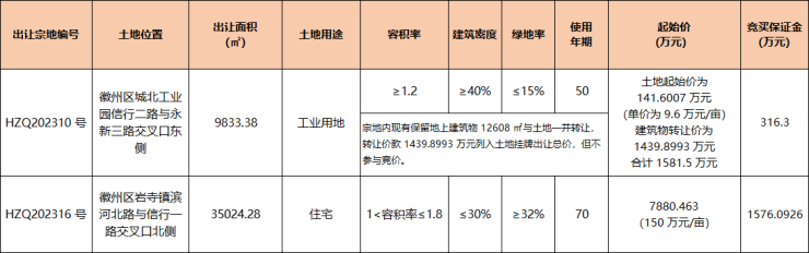 另有1宗9833.38 ㎡工业用地同一天挂牌,宗地编号HZQ202310号。
