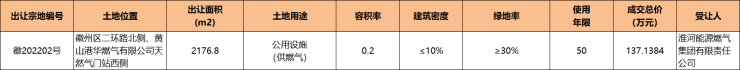 徽州区1宗公用设施用地成交,由淮河能源燃气集团有限责任公司竞得