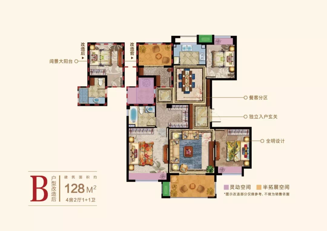 譬如约128㎡大四房设计:餐客厅分区,南向衔接阔景阳台,宽致格局烘托主人显赫身份;三个情景大飘窗,超高附加值,生活延伸更出彩。