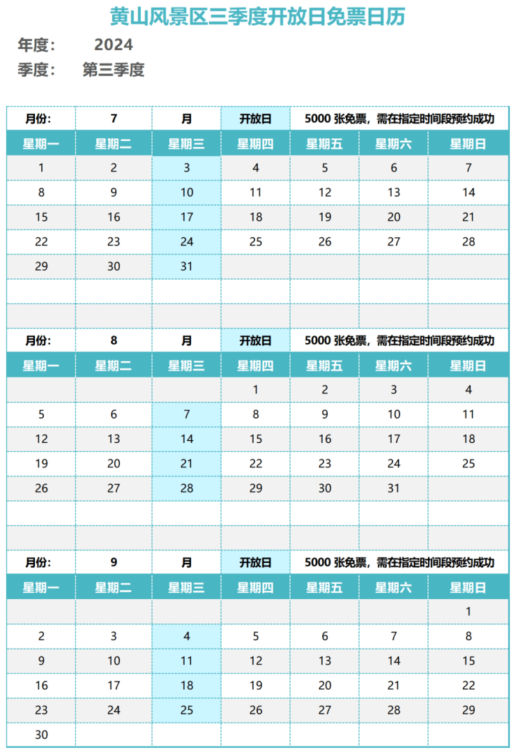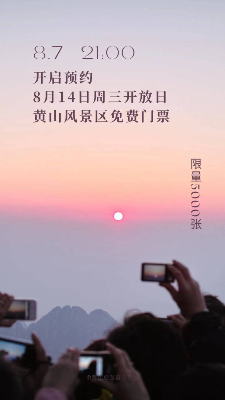 1.黄山风景区在开放日当天对提前有预约且领取门票消费券的游客免门票开放,开放日当天黄山风景区投放5000张免费门票。(特指景区的首道门票,不含景区内索道、景交换乘等其他参观游览项目和二次消费项目)
