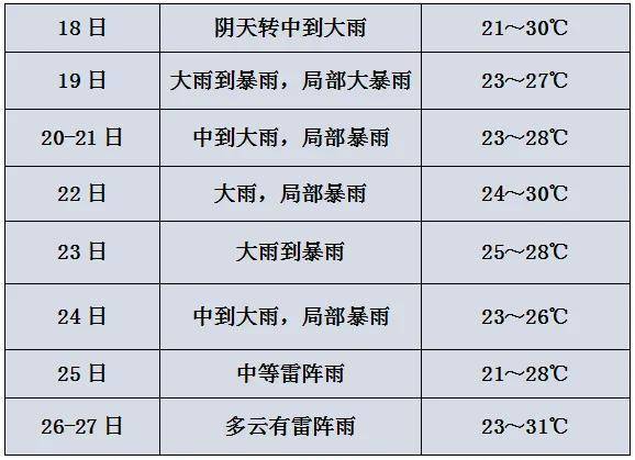 降水和强对流:预计19日我市入梅,将进入降水集中期。25日前我市多强降水过程,其中18日夜里至19日我市有大雨到暴雨,局部大暴雨。20-22日主雨带略有北抬,我市中到大雨,部分地区暴雨。受冷空气影响,23-24日主雨带南落,我市部分地区大雨到暴雨,局部大暴雨。25日白天至27日主雨带再次北抬,我市以雷阵雨天气为主,部分地区雨量中等。未来十天全市累计降水量:250~300毫米,局部地区300~400毫米,过程将伴有短时强降水(最大小时雨强40~60毫米,局部达70毫米以上)、8~10级雷暴大风等强对流天气。