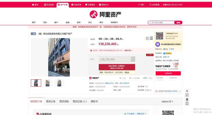 据阿里法拍网信息显示,黄山君胜置业有限公司破产财产于2023年8月24日10时至2023年8月25日10时止(延时除外)在淘宝网司法拍卖网络平台上进行公开拍卖活动。