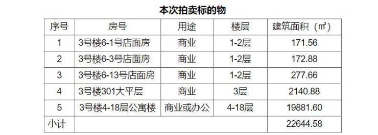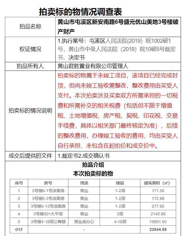 本次拍卖标的物为黄山市屯溪区新安南路6号盛元优山美地3号楼破产财产,详见下表。