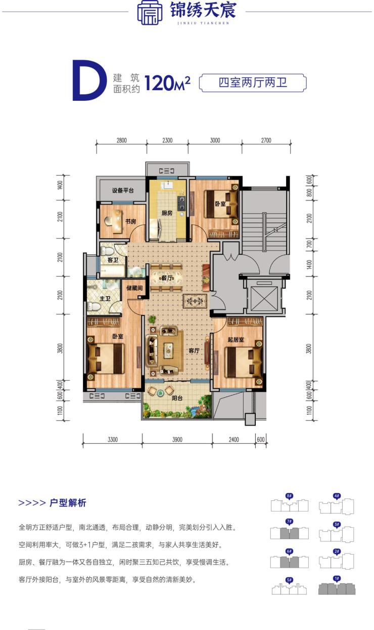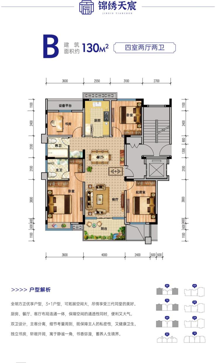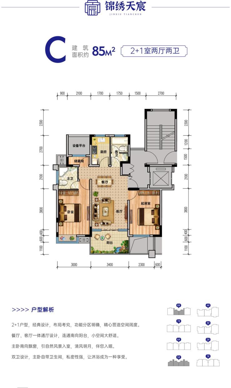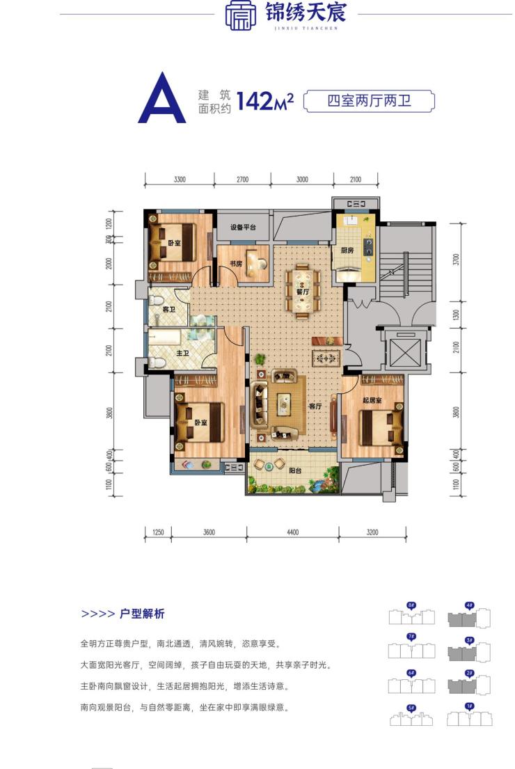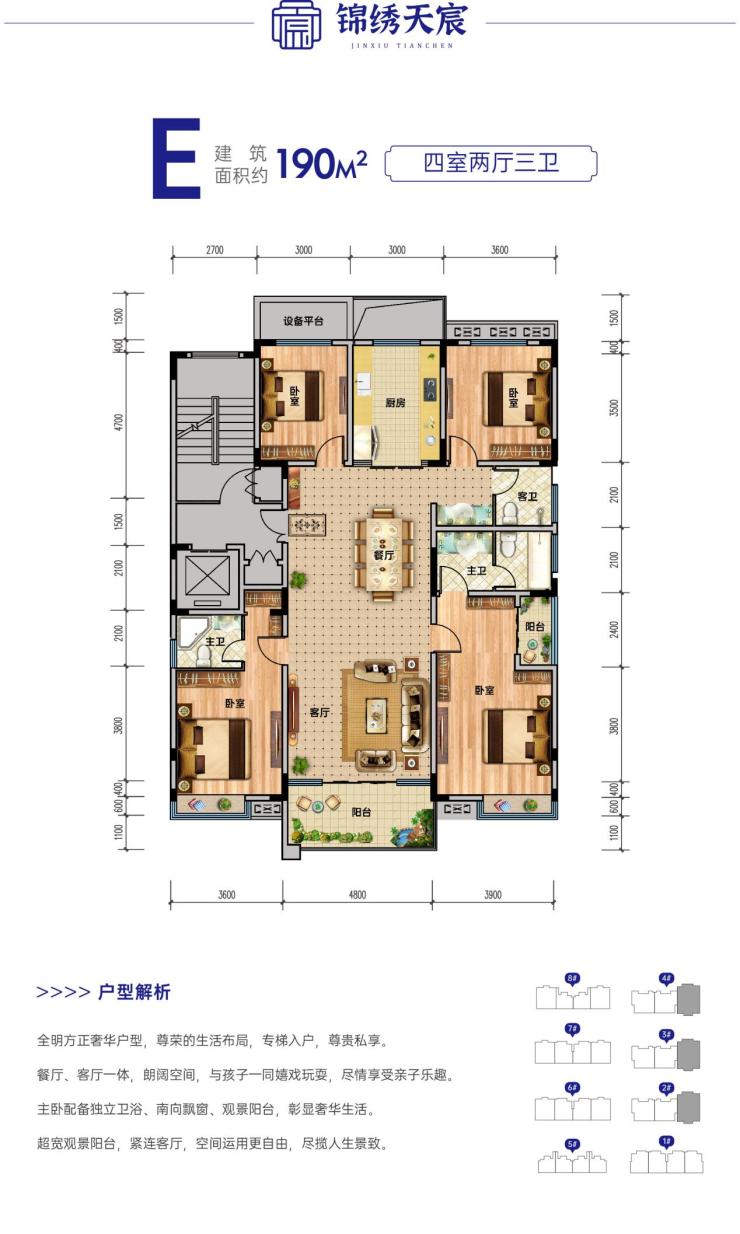锦绣天宸楼栋与楼栋间距阔绰,充分保障邻里之间私密。匠心打造85-190㎡户型,南北通透,更有双连接阳台,带来更宽广的视野,造就阳光明媚的品质人居。