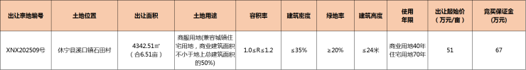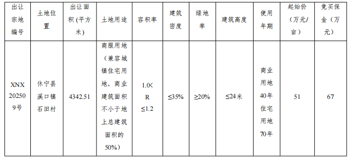 2025年8月5日,休宁县溪口镇石田村1宗商住用地(宗地编号:XNX202509号)挂牌出让,出让面积4342.51㎡(合6.51亩),容积率1.0-1.2(商业建筑面积不小于地上总建筑面积的50%),起始出让总价332.01万元,土地单价为51万元/亩(764.56元/㎡),起拍楼面地价637.13元/㎡。拍卖时间:2025年9月3日15时30分。