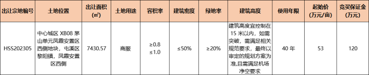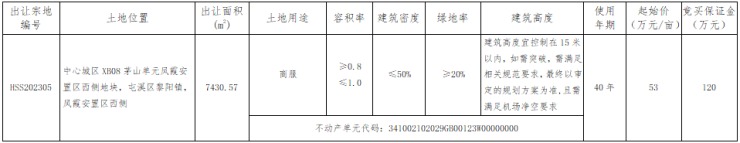 9月6日,黄山中心城区 XB08 茅山单元凤霞安置区西侧地块挂牌出让,土地位置位于屯溪区黎阳镇凤霞安置区西侧,土地性质为商服,出让面积7430.57㎡(11.15 亩),容积率≥0.8、≤1.0,起始总价为590.7303 万元、起始单价为 53 万元/亩(795 元/ ㎡)。拍卖时间:2023年10月16日下午15时30分。