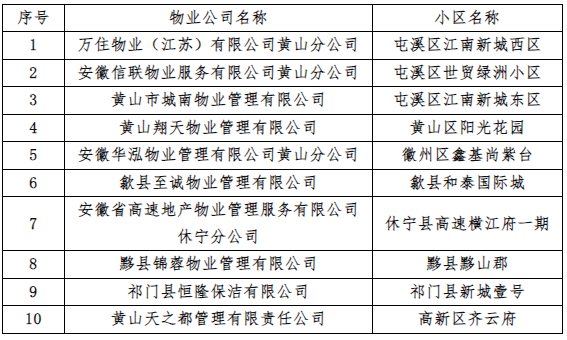 根据省住建厅《关于实施“加强物业管理 共建美好家园”活动的通知》部署和《黄山市关于实施“加强物业管理 共建美好家园”活动方案》工作安排,通过主动申报、街道社区初审、县区物管部门择优选树推荐,经过市级现场验收,综合评审,现拟向省住建厅推报10个“美好家园”住宅小区,予以公示(排名不分先后):